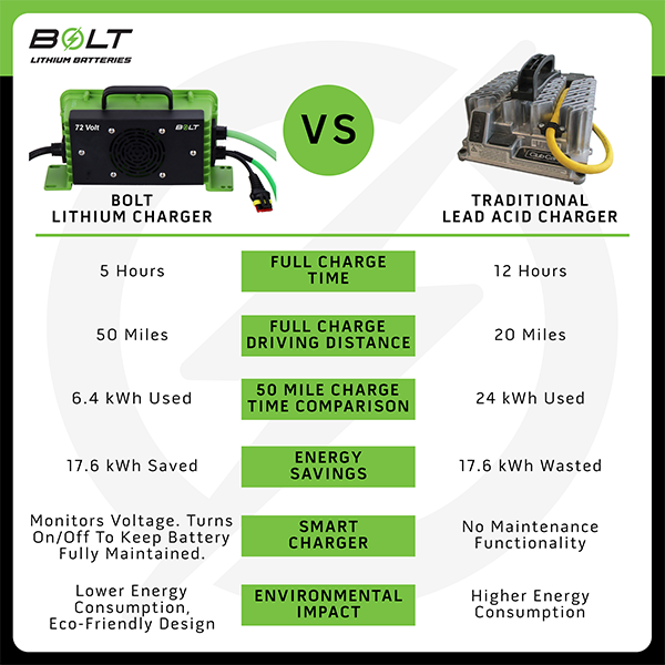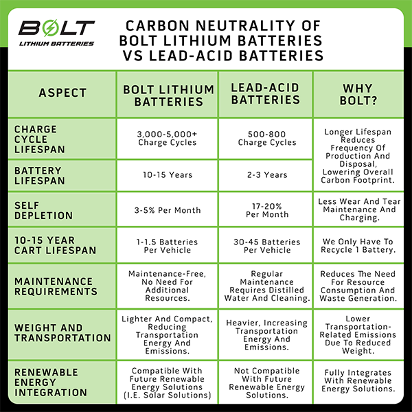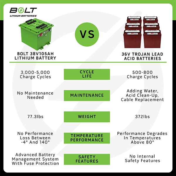 Bolt Energy stands out against lead acid battery options by combining a purposeful design, quality performance and long lasting reliability. Here’s why switching to Bolt Lithium Batteries is the smartest choice for your cart: